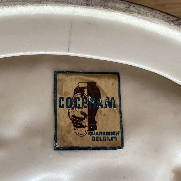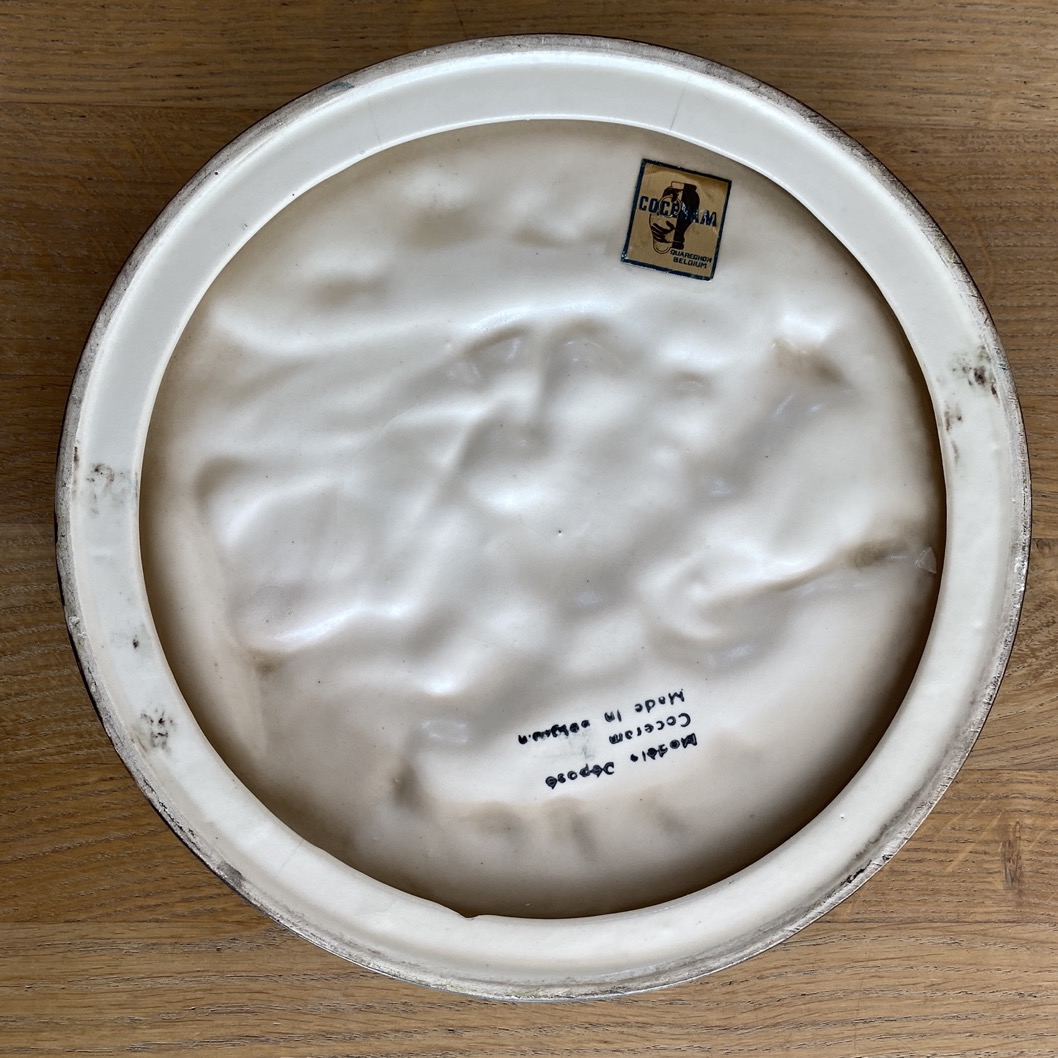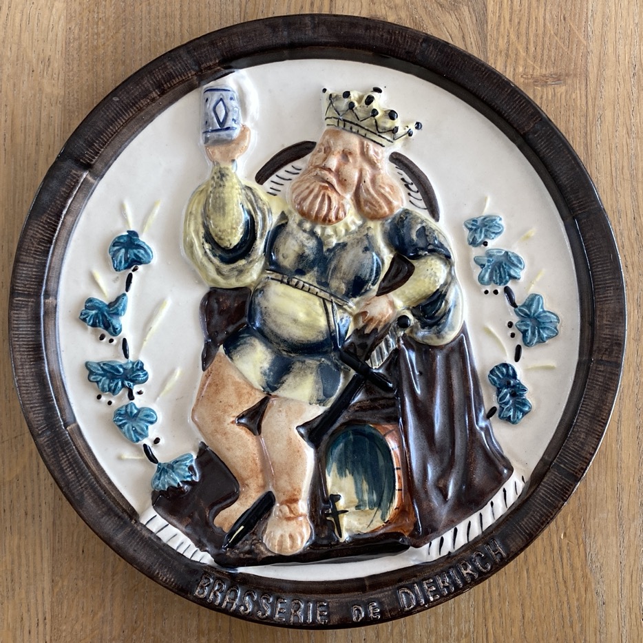 Plaque en faïence (24 cm de diamètre) avec une représentation de Bacchus, pour la Brasserie de Diekirch. Elle a été produite par Coceram ( fondée par les frères Hector et Maurice Colin en 1947. Elle fermait en 1960). L’accent de la production a été mis sur des pièces, raviers ou cendriers publicitaires, mais on produisait aussi des vases, des pichets et des pièces décoratives divers.). En très bon état, elle date des années 1950.