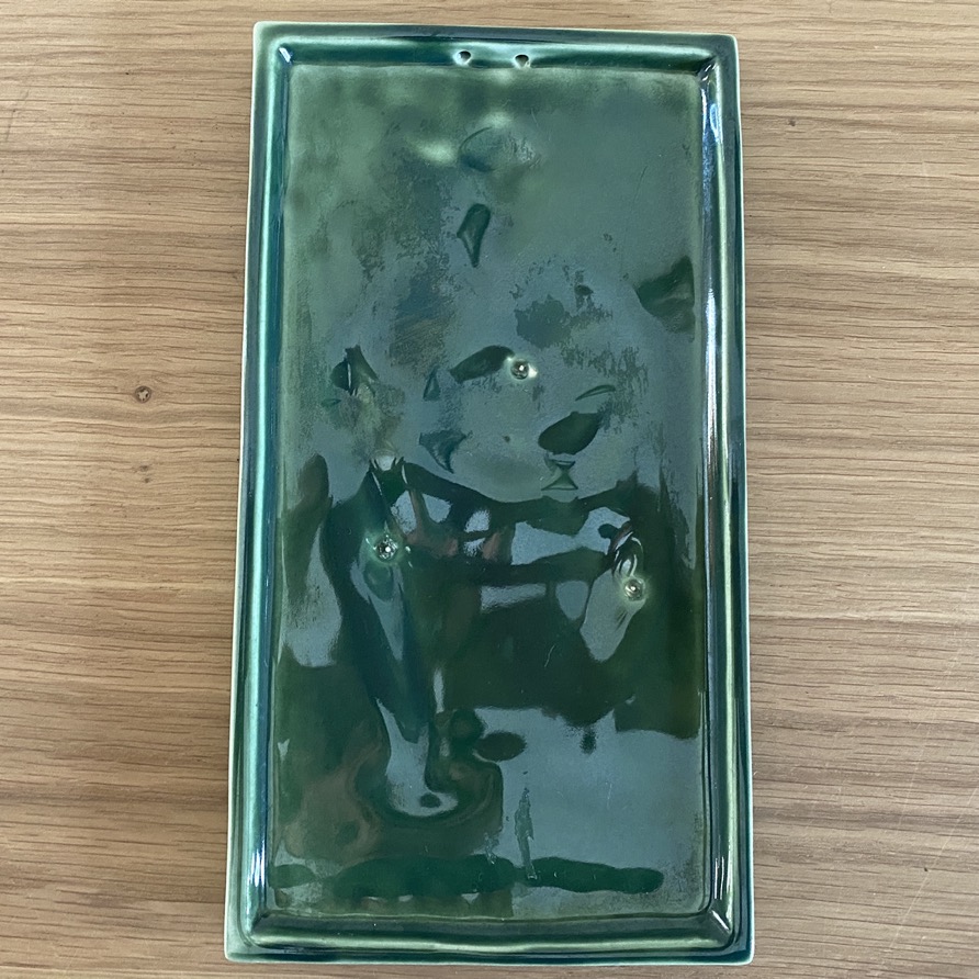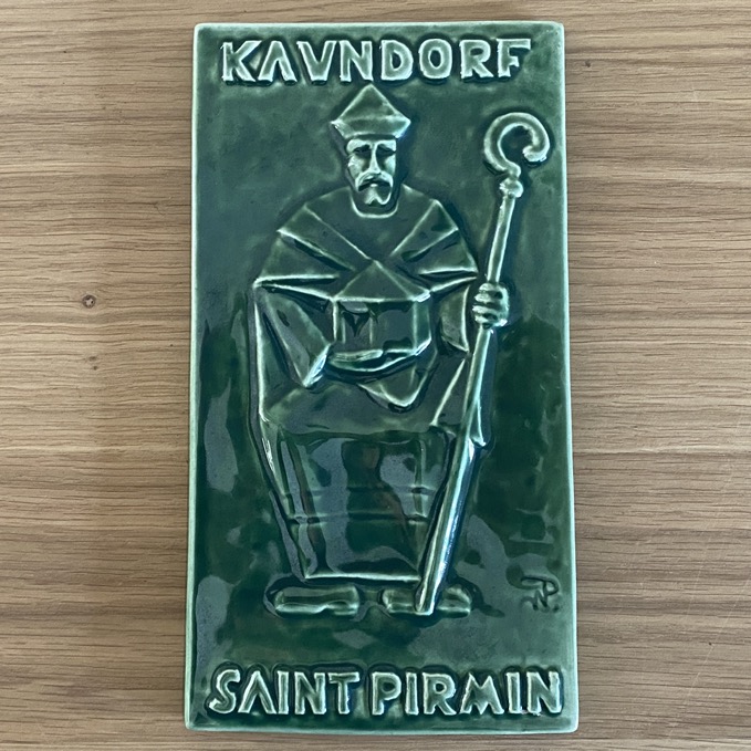 Plaque en grès émaillée (18,5×10 cm) avec une représentation de Saint Pirmin (Scarapsus St. Pirminus 8è siècle). A Kaundorf, des processions régulières sont organisées à la Chapelle St Pirmin. La plaque en très bon état est signée WP (Wenzel Profant 1913-1989) et a été produite par Villeroy & Boch.