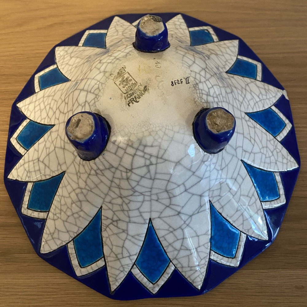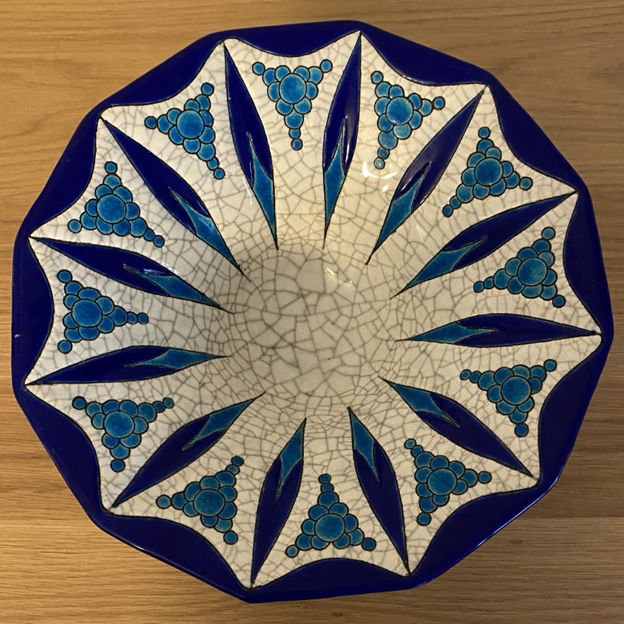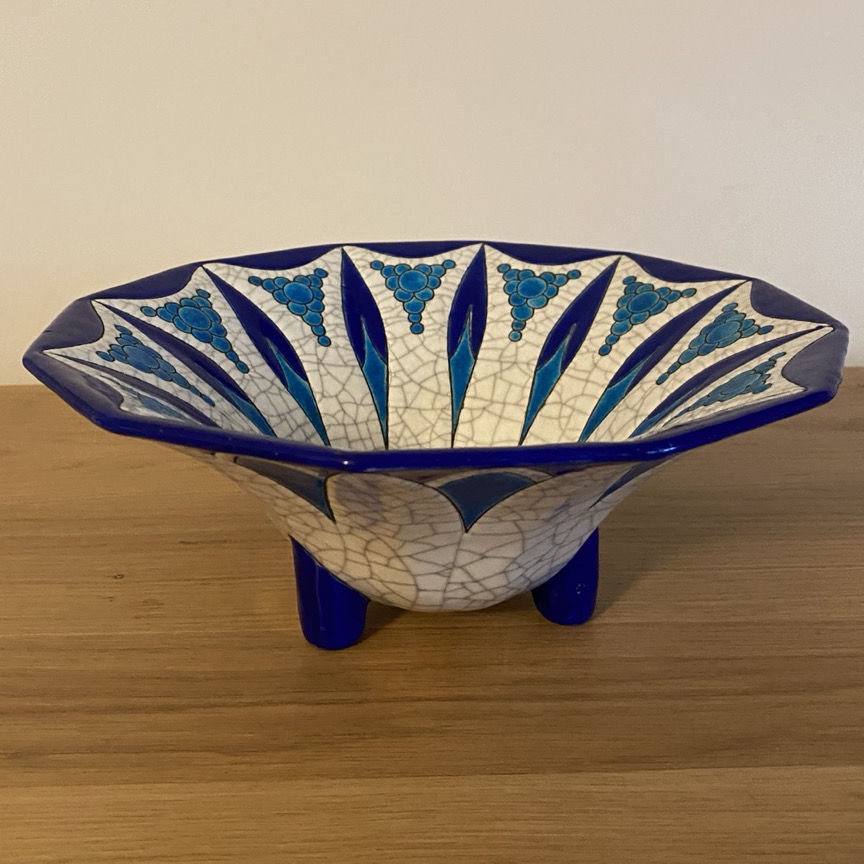 Beau plat en Faïence émaillée de Longwy (26 cm de diamètre) en forme de coupe évasée sur trois petits pieds. Il est marqué dessous « D.5238 » et porte le cachet de Longwy. Il porte également en creux le chiffre « 3134 ».