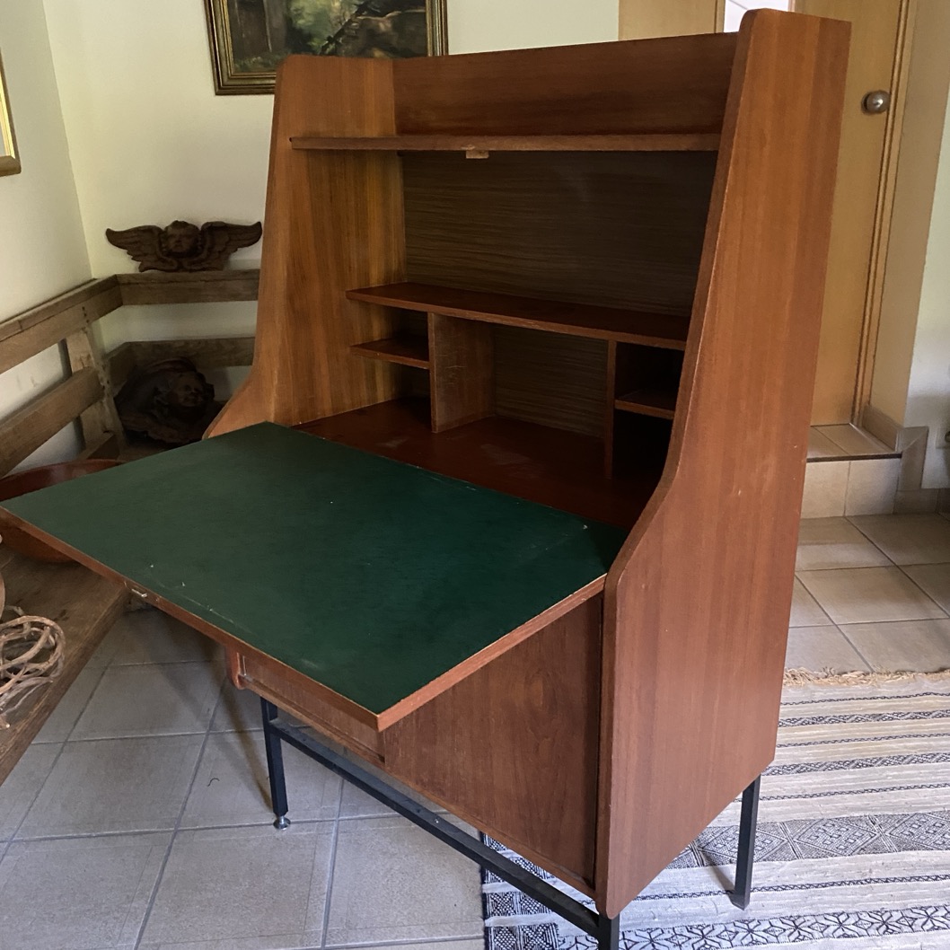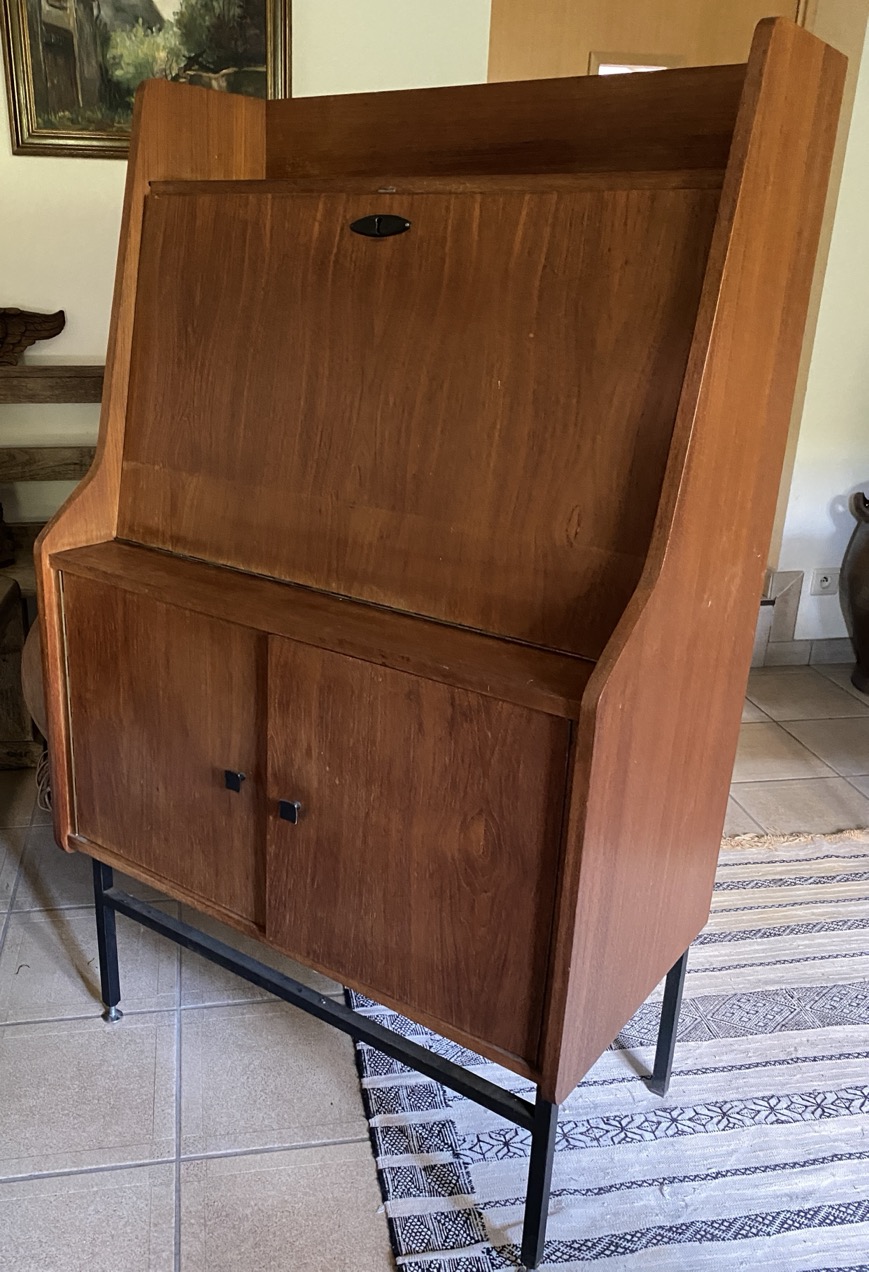 Secrétaire en bois (130 cm de haut, 80 cm de long et 44 cm de profond) datant sans doute des années 1950. Il est sur 4 pieds en métal dont deux sont réglables en hauteur. Il est en bon état.