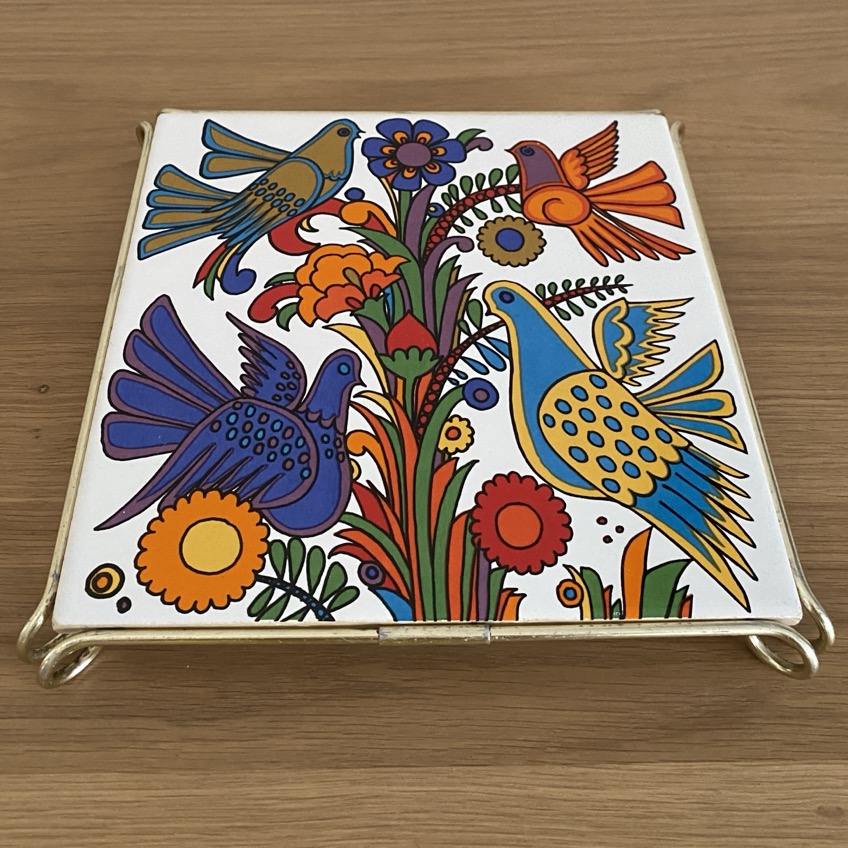 Beau sous-plat (20×20 cm) en faïence sur socle en métal. Il est de la collection Acapulco, designer Christine Reuter et produite par Villeroy et Boch Luxembourg à la fin des années 1960-70. Il est poinçonné à l’arrière.