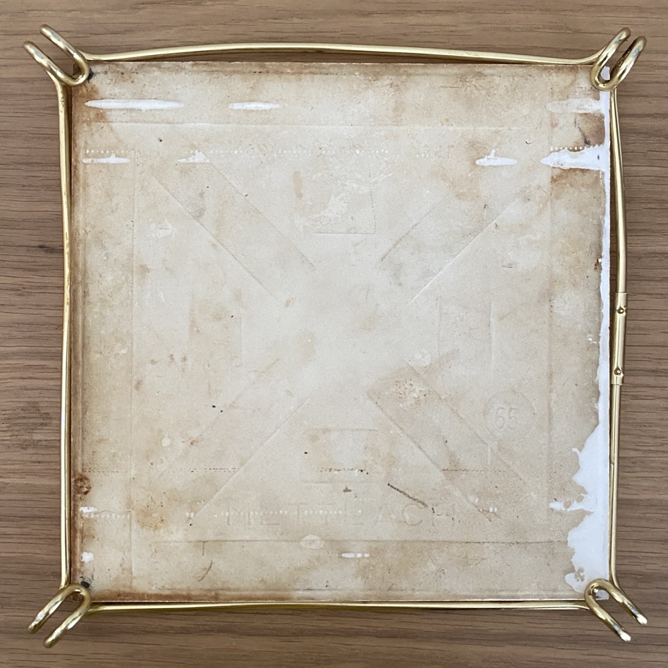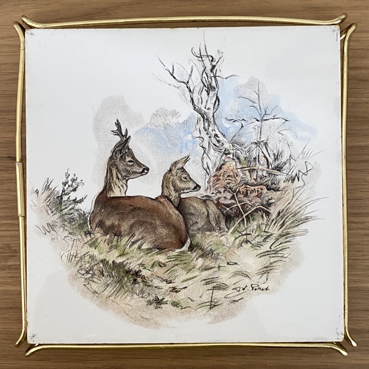 Sous-plat composé d’un carrelage (15x15cm) sur un support métallique doré. Le carrelage représente un couple de chevreuils d’après un dessin de Xavier von Poret (1894-1975) et a été produit par Villroy et Boch à Mettlach.