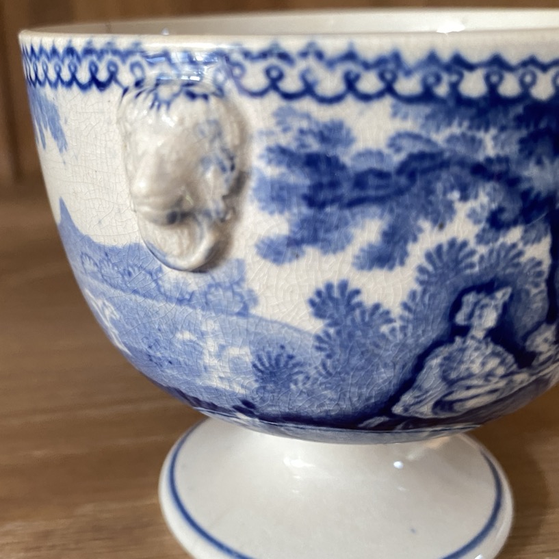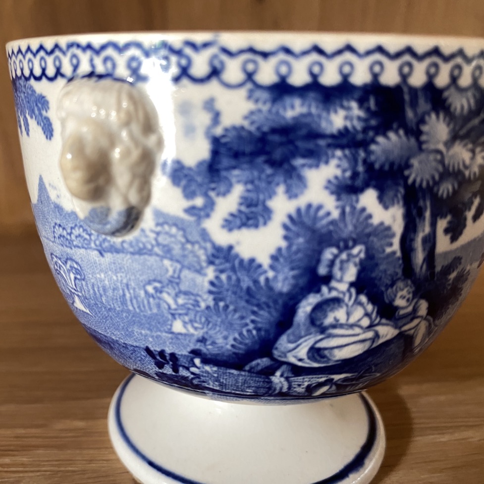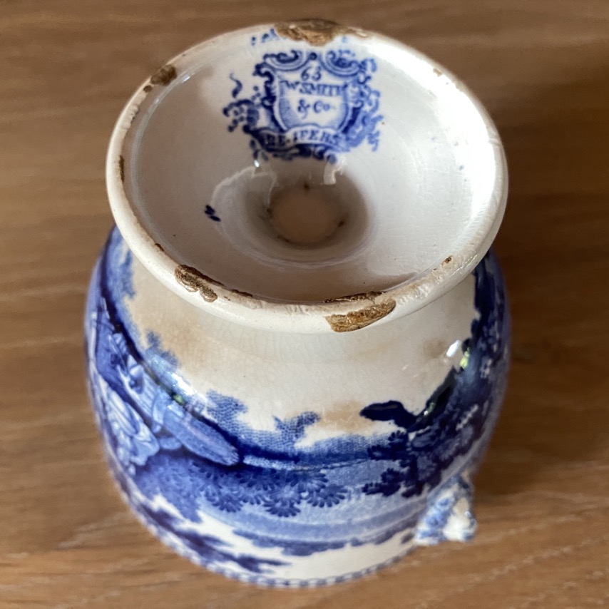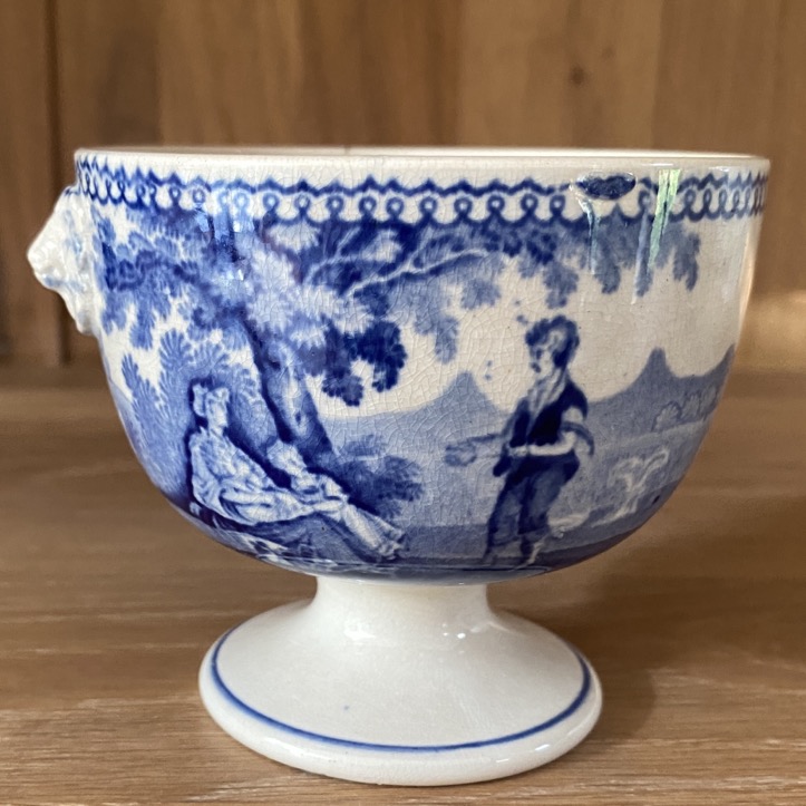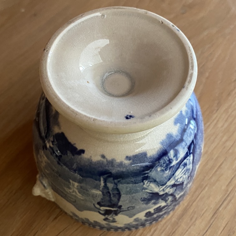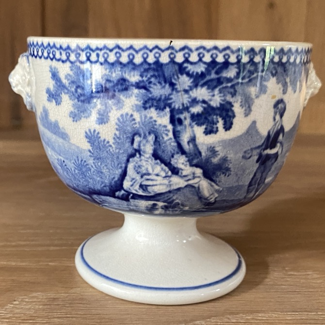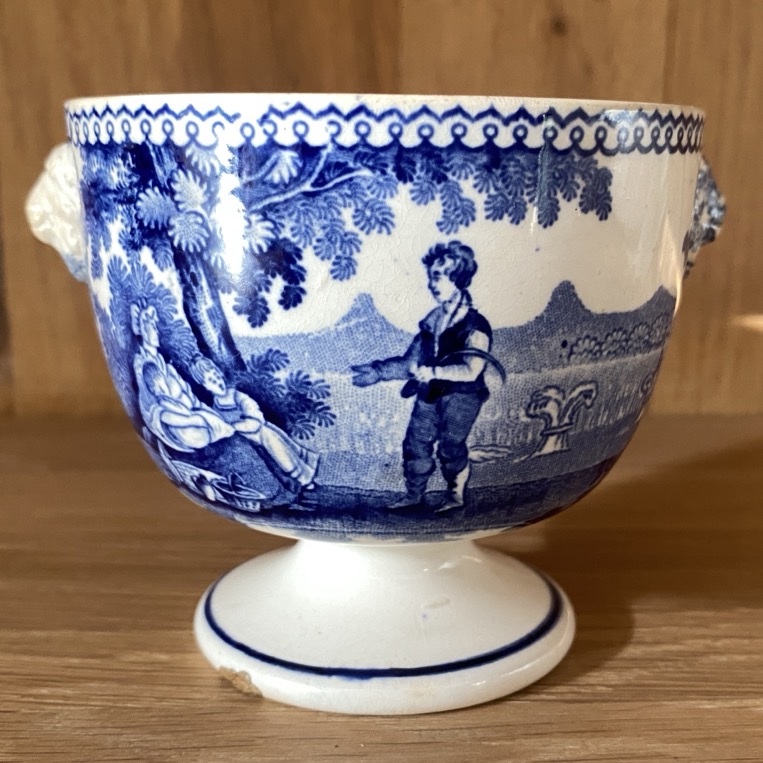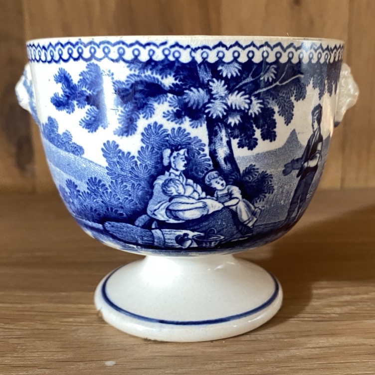 Sucrier en faïence fine sans couvercle (8 cm de haut) de forme Empire, portant des représentations de scènes villageoises, récolte du blé. Il est marqué dessous d’un cachet bleu « 63/W Smith & co/ … ». Petites anses en têtes de lion. Ce sucrier est issu soit de la manufacture de Jemappes (1837-1894). Cette manufacture créée en 1837 par Auguste Picard et Eugène Willems est rachetée en 1847 par l’industriel Jean-Baptiste Cappellemans en association avec l’l’Anglais William Smith. Les décors de Jemappes imprimés par transfert en noir, vert, bleu et violet sont très vite reconnus dans toutes les expositions. Soit il est issu de la manufacture de William Smith à Sockton-on-Tees en Angleterre (1826-1855).
