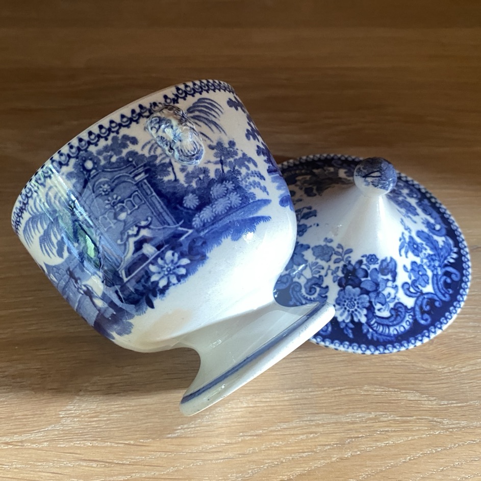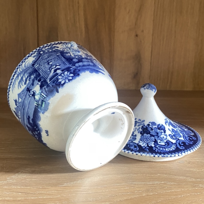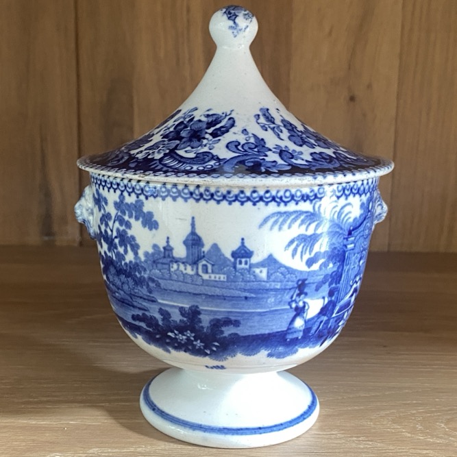 Sucrier en faïence fine (15 cm de haut couvercle compris) de forme Empire, portant des représentations des scènes villageoises devant une fontaine. Il n’est pas marqué . Petites anses en têtes de lion. Ce sucrier est sans doute issu de la manufacture de Jemappes (1837-1894). Cette manufacture créée en 1837 par Auguste Picard et Eugène Willems est rachetée en 1847 par l’industriel Jean-Baptiste Cappellemans en association avec l’l’Anglais William Smith. Les décors de Jemappes imprimés par transfert en noir, vert, bleu et violet sont très vite reconnus dans toutes les expositions.