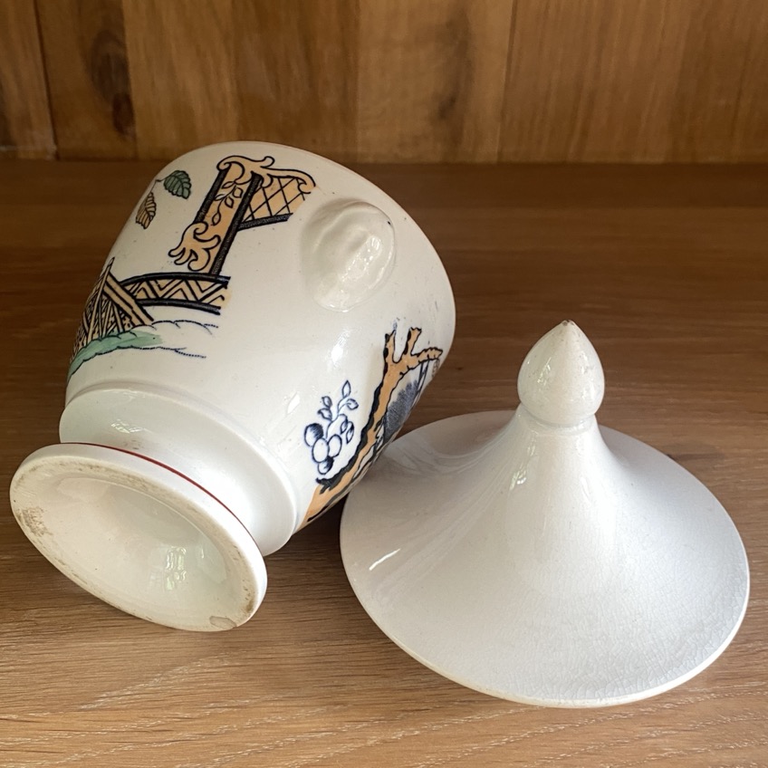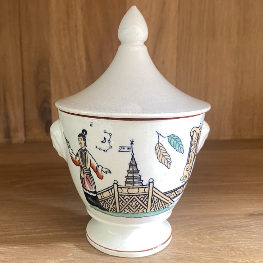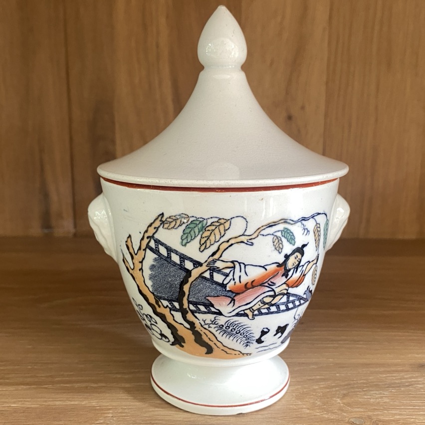 Sucrier en faïence fine (16 cm de haut couvercle compris) portant des représentations orientales et non marquée. Petites anses en forme de têtes féminines. « Timor » montre un décor oriental, utilisé sur la vaisselle haut de gamme produite entre 1880 et 1930 pour le marché des Indes orientales néerlandaises. Cette tasse date de la fin du 19è siècle et est sans doute une production des Pays-Bas, Société Céramique (1863-1958 fusion avec Sphinx Petrus Regout Céramique).