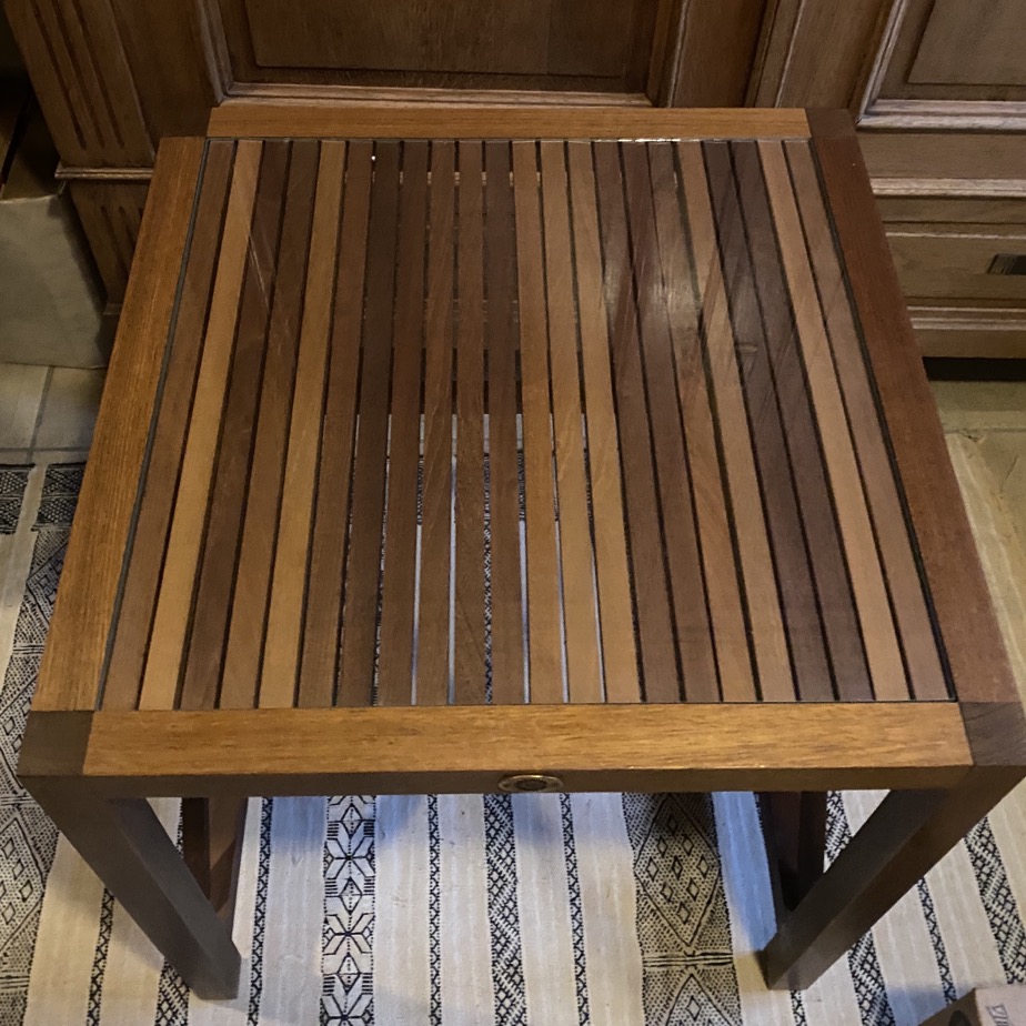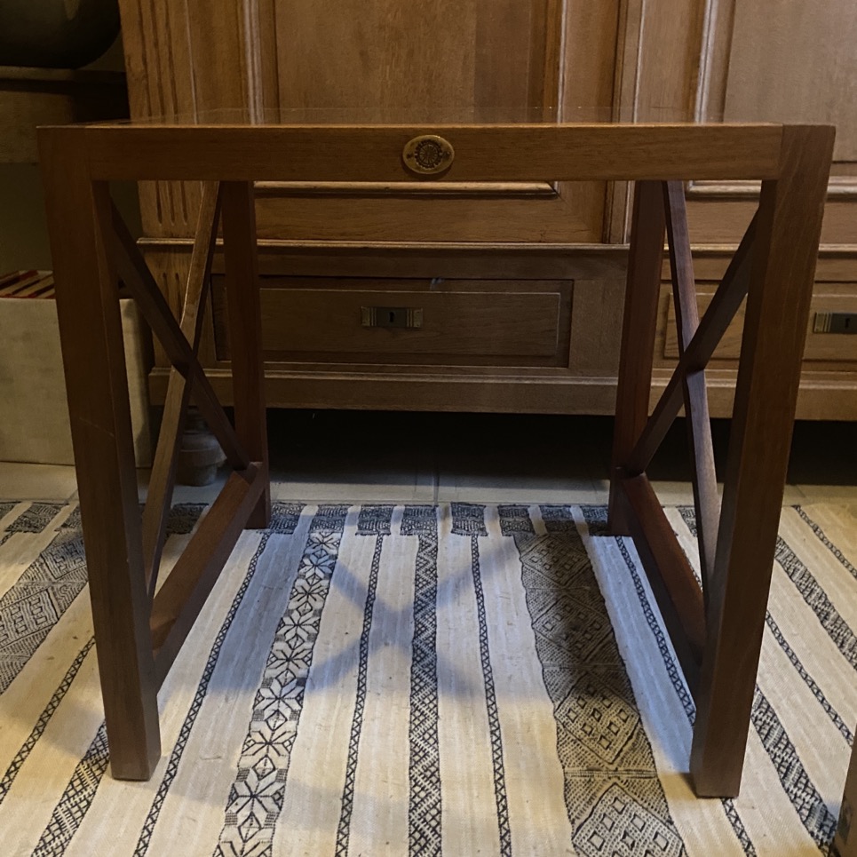 Petite table cubique (59x59x59 cm) en bois recouverte d’un verre, de style colonial hollandais.