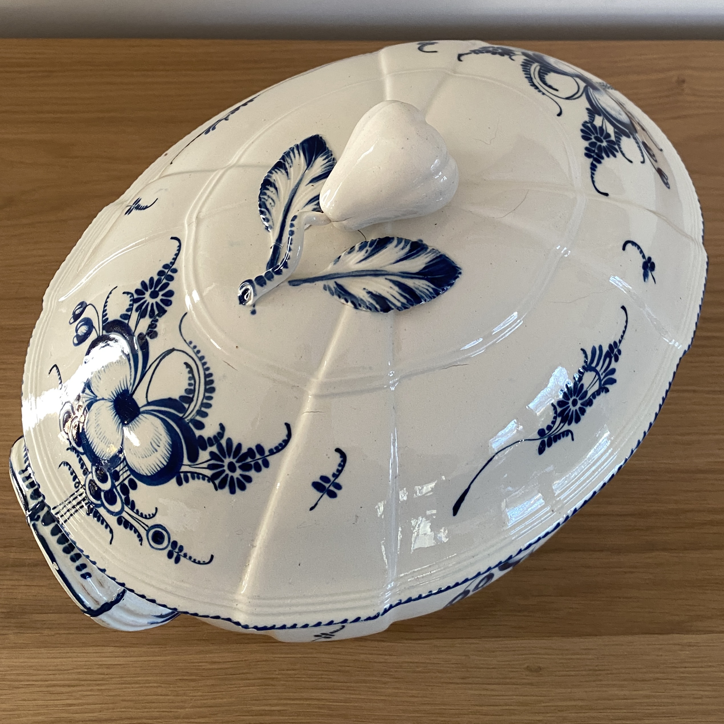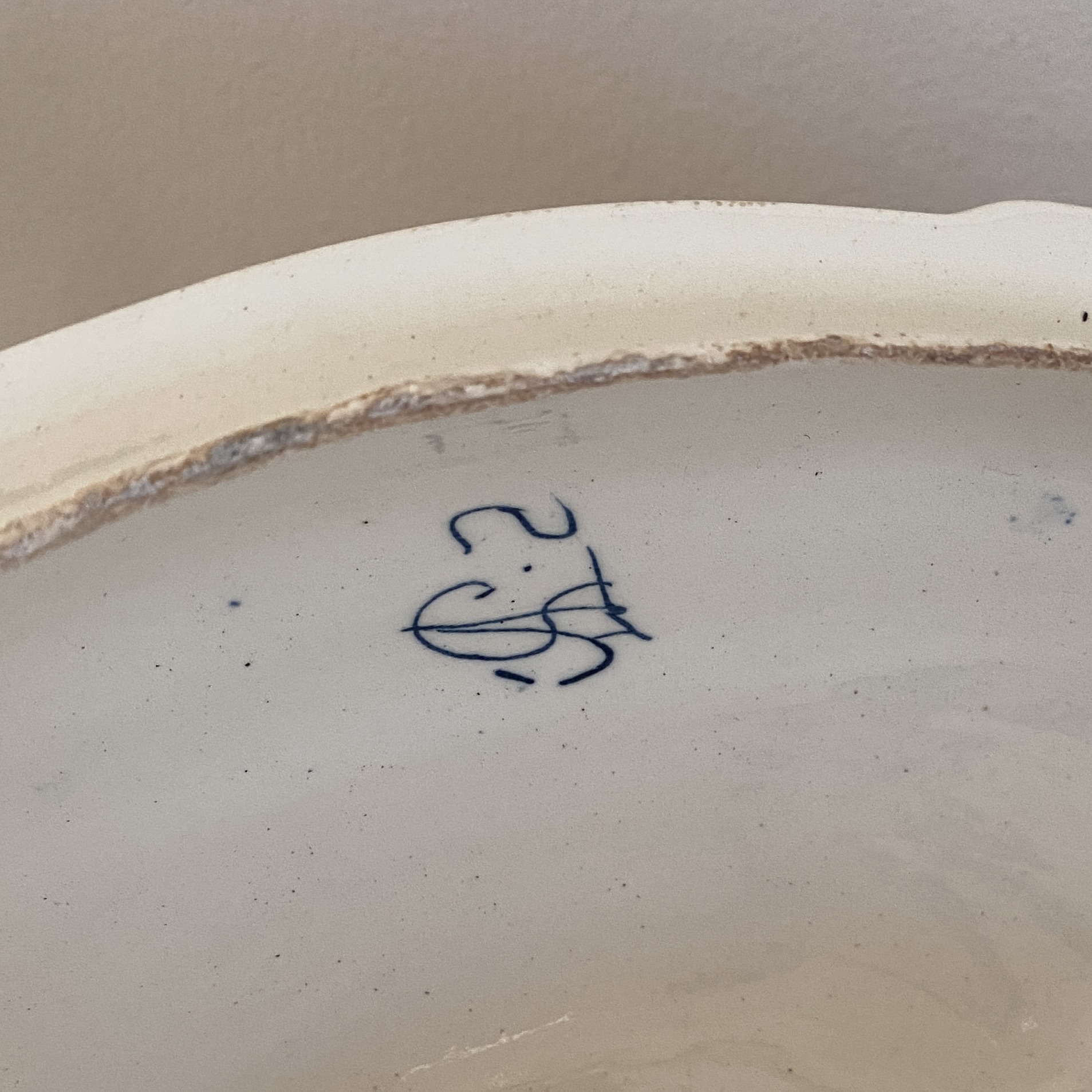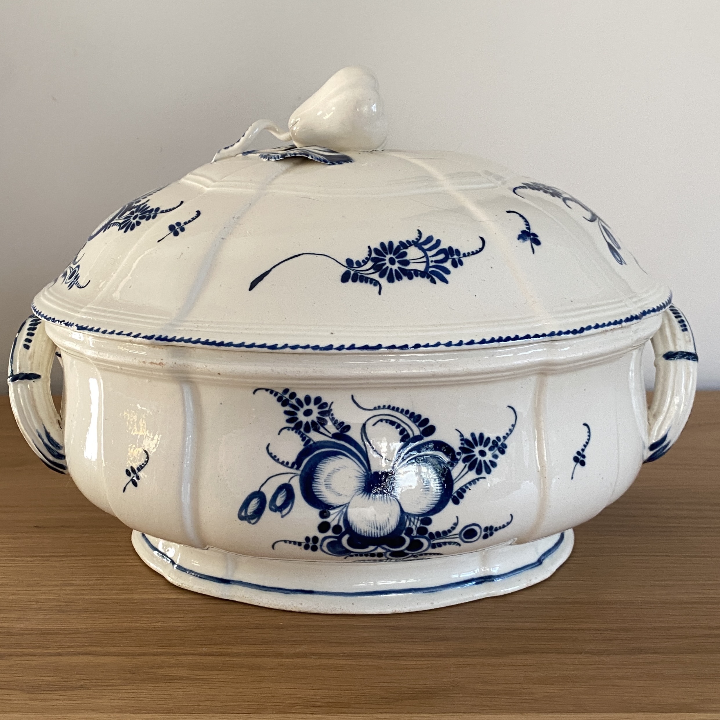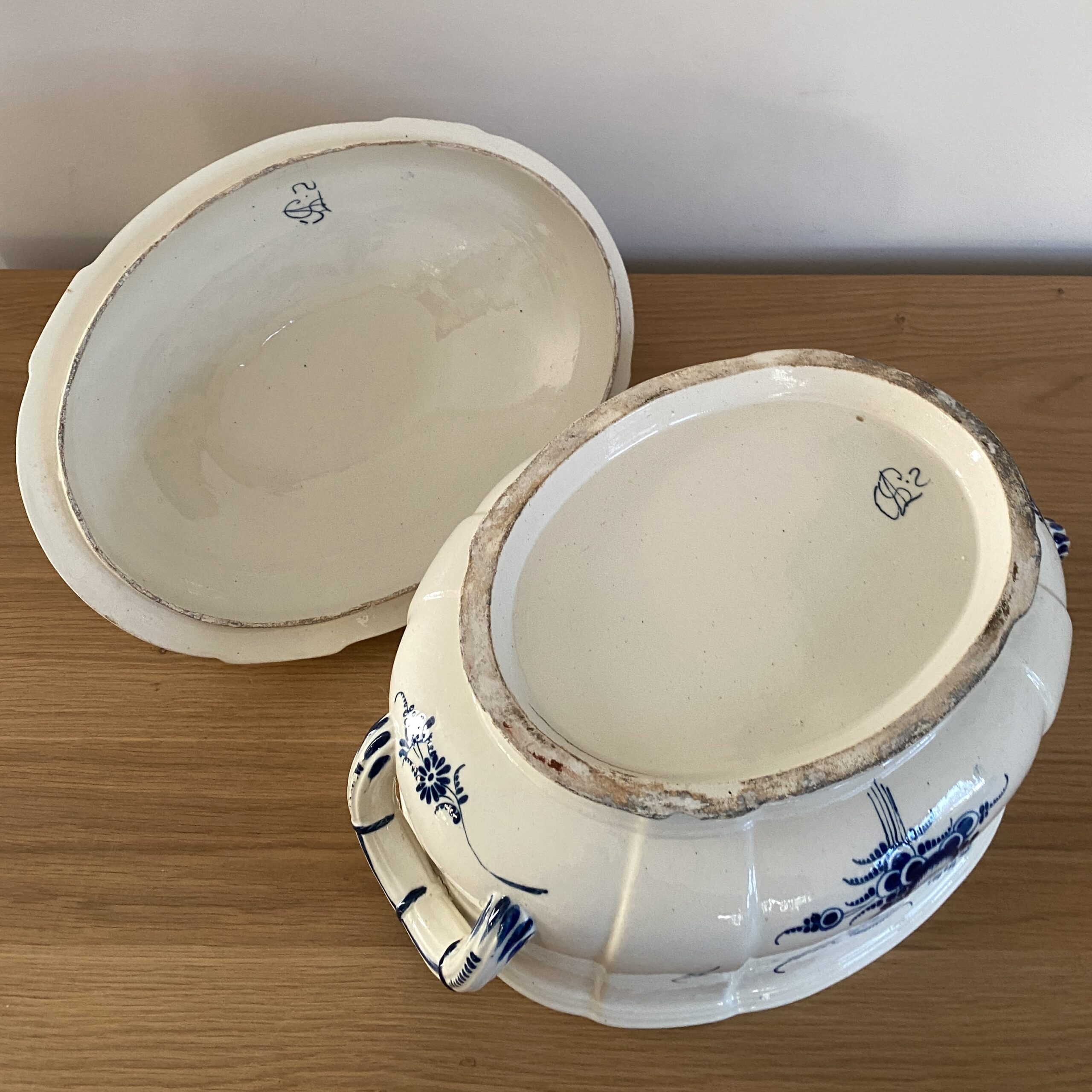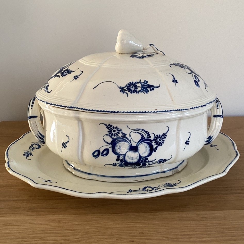 Ensemble en faïence de la manufacture d’Attert (1780-1809) composé d’une terrine ovale (28 cm de long sans anses) et son plateau (39 cm de long) de forme de style régence, avec un décor en camaïeu bleu au grand feu dit « Au trèfle » . Le couvercle possède un fretel en forme de poire couchée avec tigelle et deux feuilles peintes en bleu. Le plateau de forme festonnée, décoré de dents de loup en bordure et brindilles sur l’aile, porte un décor « Aux trèfles » au centre du bassin. Les deux éléments portent les marques d’Attert : APL2 sous la terrine et sous le couvercle; APL5 sous le plateau. La faïencerie d’Attert a été créée par Jean-Michel Poncelet qui transforma la demeure familiale (le Domaine Poncelet) qu’il agrandira pour ses fins de production.