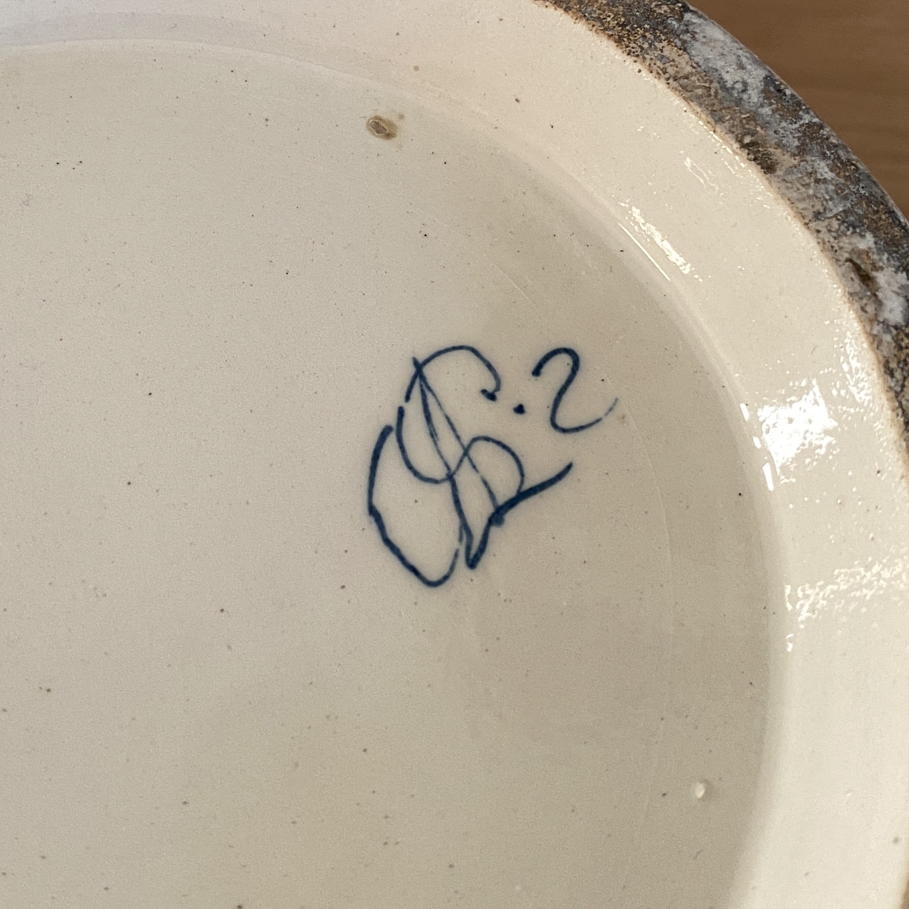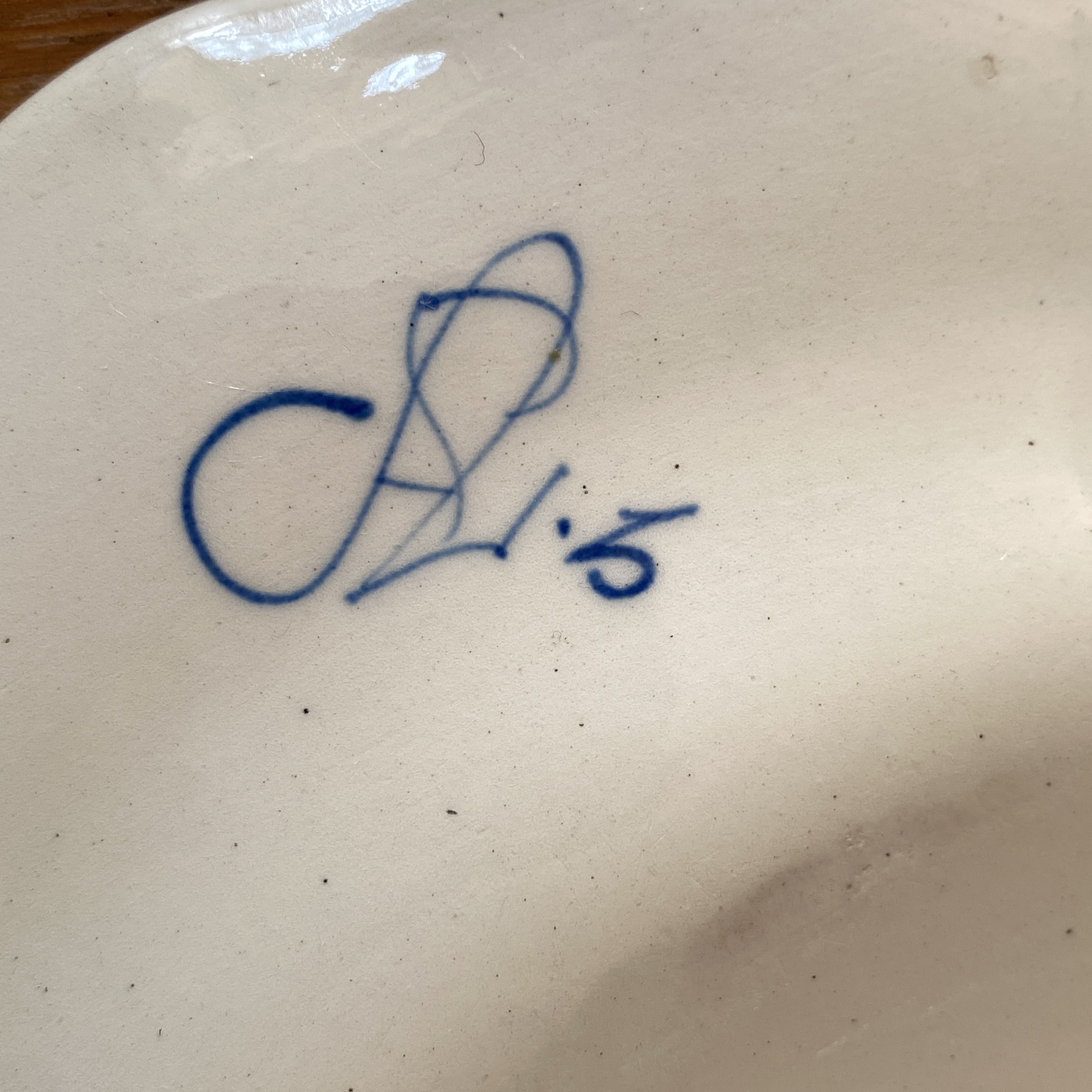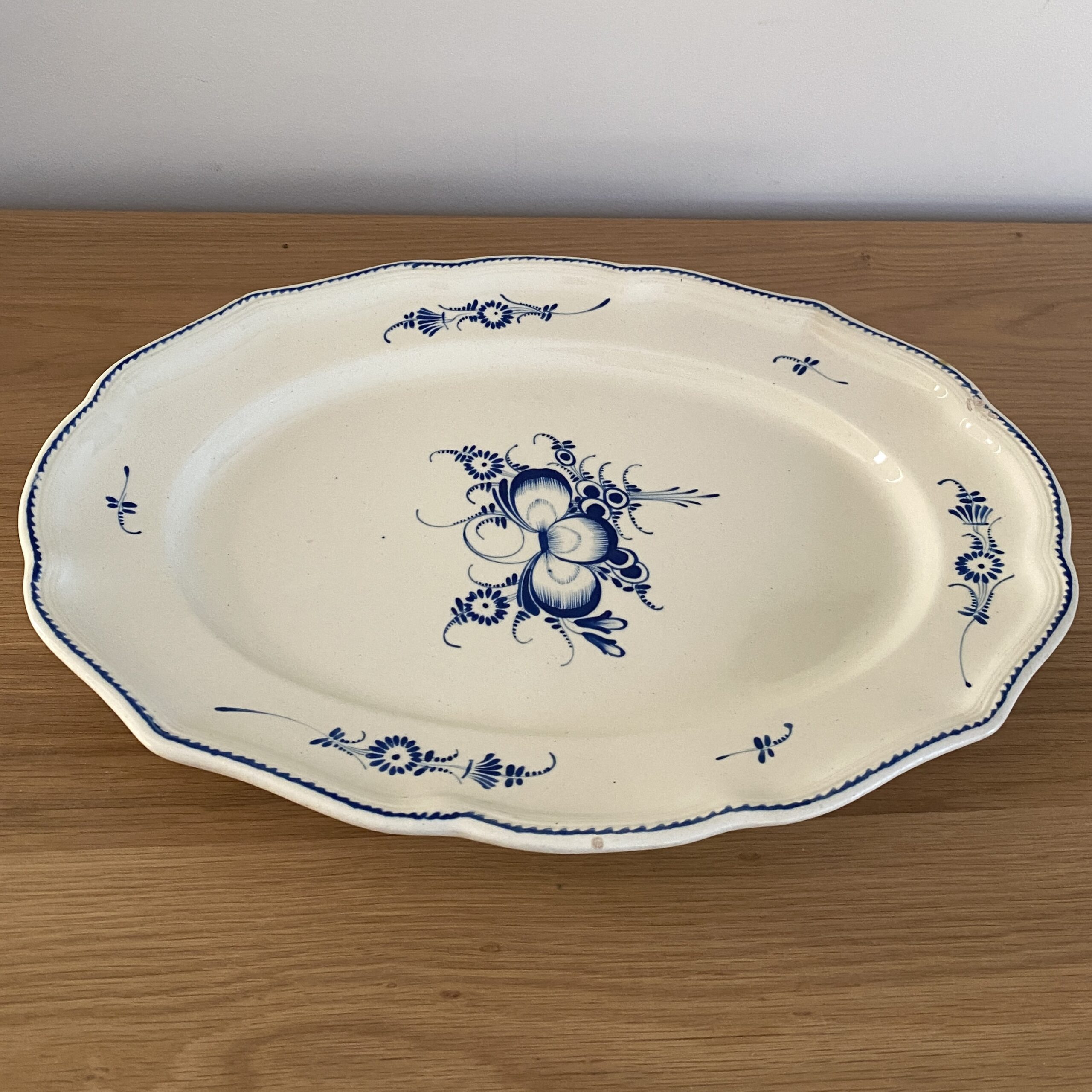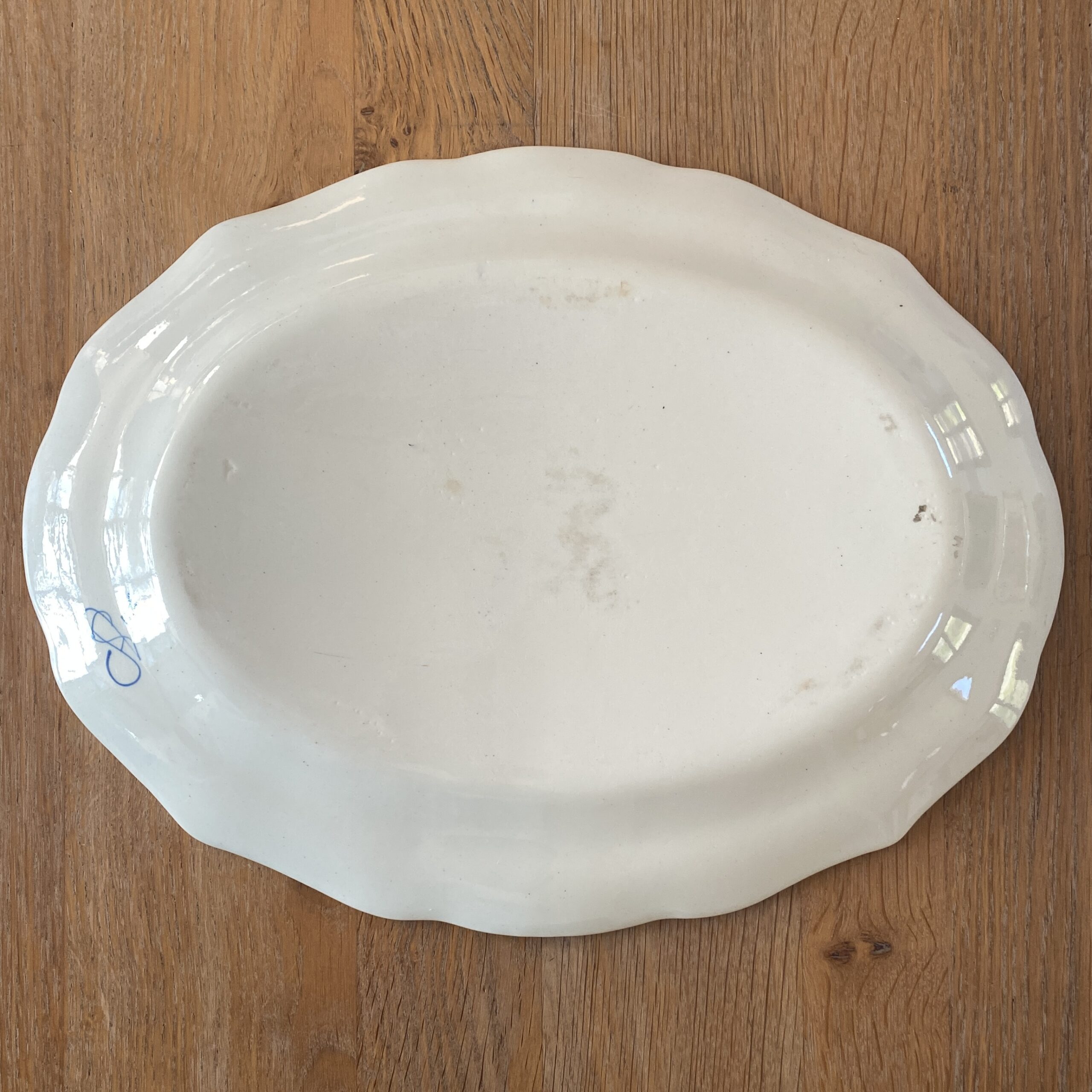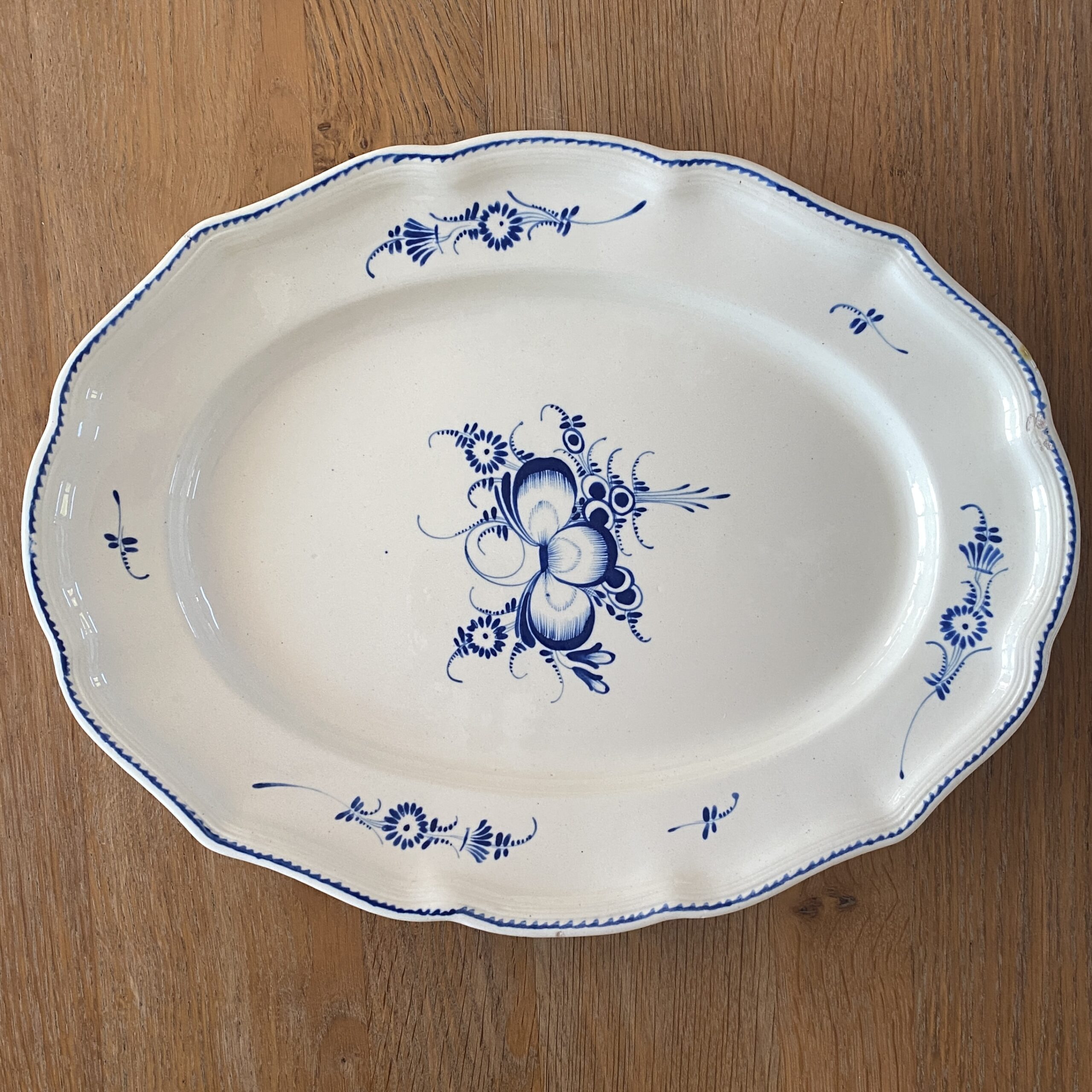 Ensemble en faïence de la manufacture d’Attert (1780-1809) composé d’une terrine ovale (28 cm de long sans anses) et son plateau (39 cm de long) de forme de style régence, avec un décor en camaïeu bleu au grand feu dit « Au trèfle » . Le couvercle possède un fretel en forme de poire couchée avec tigelle et deux feuilles peintes en bleu. Le plateau de forme festonnée, décoré de dents de loup en bordure et brindilles sur l’aile, porte un décor « Aux trèfles » au centre du bassin. Les deux éléments portent les marques d’Attert : APL2 sous la terrine et sous le couvercle; APL5 sous le plateau. La faïencerie d’Attert a été créée par Jean-Michel Poncelet qui transforma la demeure familiale (le Domaine Poncelet) qu’il agrandira pour ses fins de production.