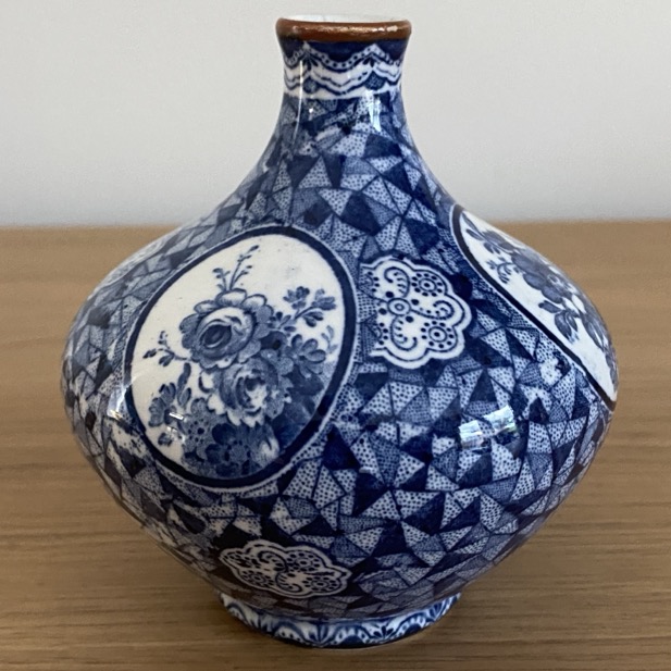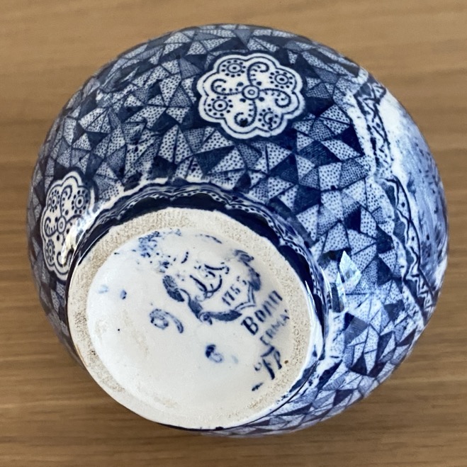 Petit vase en porcelaine (9 cm de haut) portant des décors bleu et blanc avec des bouquetes et un paysage dans des cartouches. Il est sans doute issu de la manufacture Franz Anlon Mehlem (1836-1931) à Bonn, rachetée par Villeroy et Boch en 1921 mais fermerta en 1931. Ce vase porte diverses marques, avec le monogramme « Fan » ou « An », une tour et « Royal Bonn », « 1755 ». Ce vase date sans doute du début du XXè siècle.