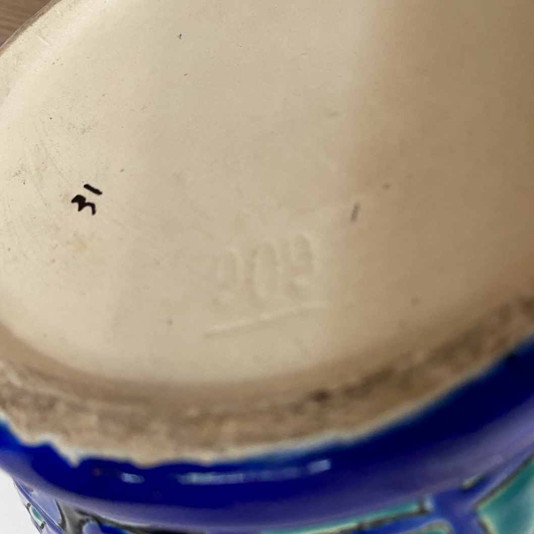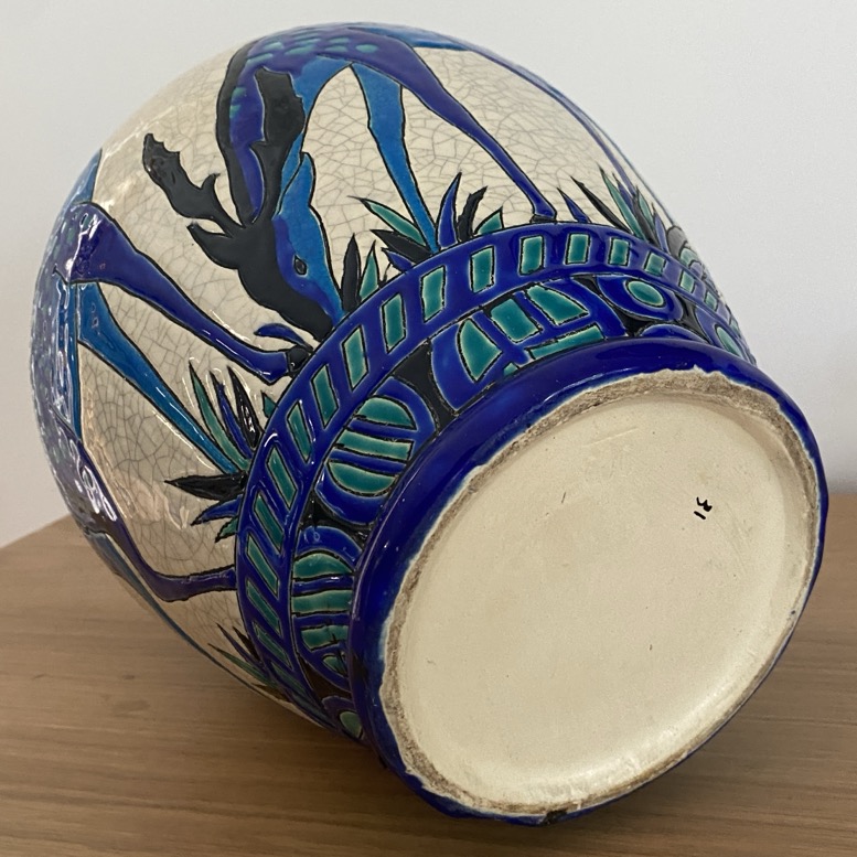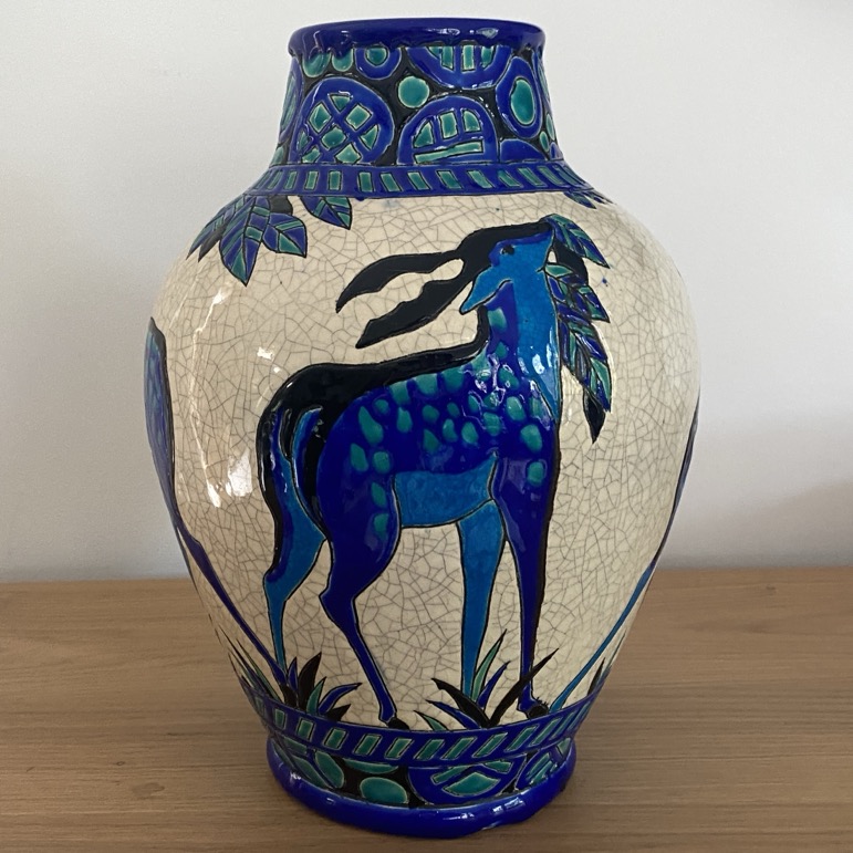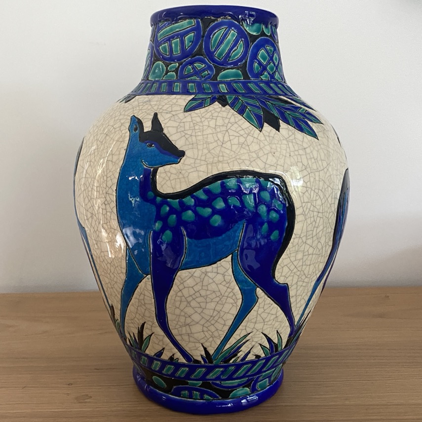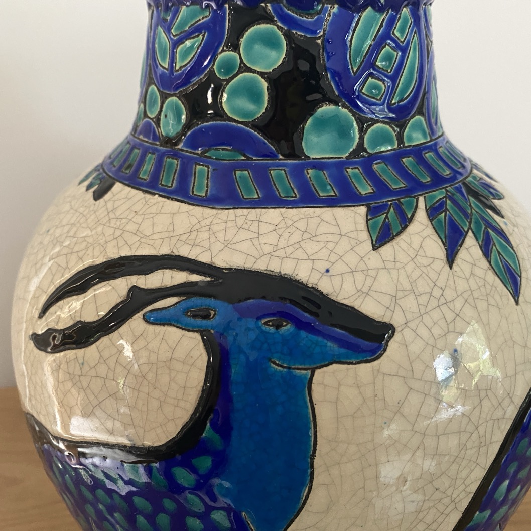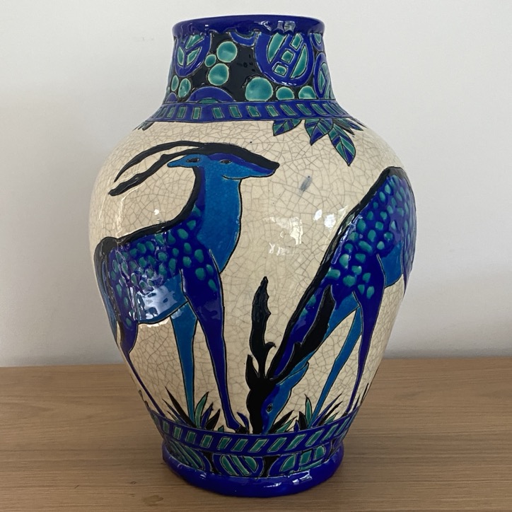 Beau vase en faïence (32 cm de haut) par Charles Catteau vers 1925 pour Boch La Louvière (il a travaillé pour l’Atelier de Fantaisie de 1906 à 1946). Il porte le numéro de forme en creux 909, Ce vase est décoré de « Daims bleus » un décor tournant d biches et cerfs émaillé bleu, noir et vert, sur fond crème craquelé créé par Charles Catteau (1880-1966). Ce décor (D943) était exposé à l’Exposition Internationale des Arts Décoratifs et Industriels de Paris en 1925. Le vase n’est pas cacheté ni signé, mais est en parfait état.