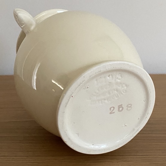 Beau vase (15 cm de haut) produit par Villeroy & Boch Luxembourg dans les années 1954-67. Il porte le cachet en creux de cette époque-là, ainsi que le numéro de forme 1019/3. Le numéro de couleur est le 258, c’est à dire beige. Ce vase a un petit éclat sur l’anse.
