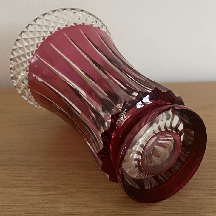 Vase (20,5 cm de haut) en cristal doublé rouge rubis et taillé en motifs géométriques. Il a été créé par Val saint Lambert, cristallerie reconnue pour son savoir-faire depuis 1826. Le vase en parfait état n’est pas signé.