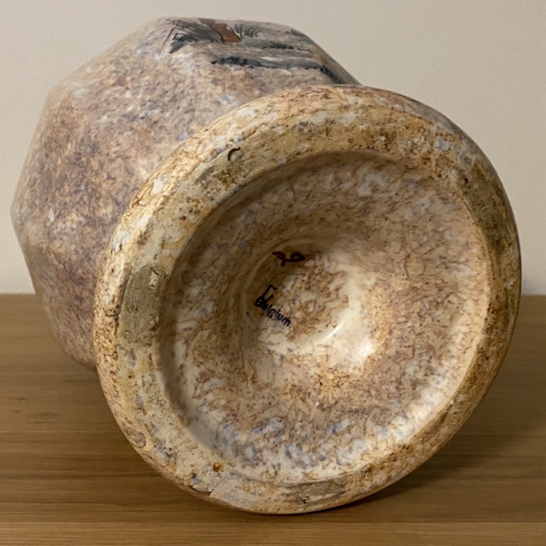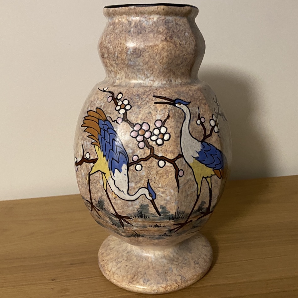 Grand vase en faïence (30 cm de haut) signé A. Dubois, Antoine Dubois (1869-1949) , et présentant un décor peint à la main de grues et de fleurs de cerisier, typique de la période Art Déco (1920-1930). Antoine Dubois a fondé sa propre entreprise, initialement appelée « Poterie de Mons en Belgique » en 1920, qui est devenue plus tard « La Céramique Montoise ».