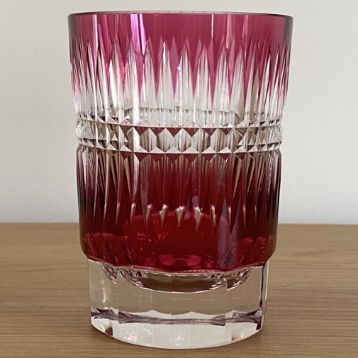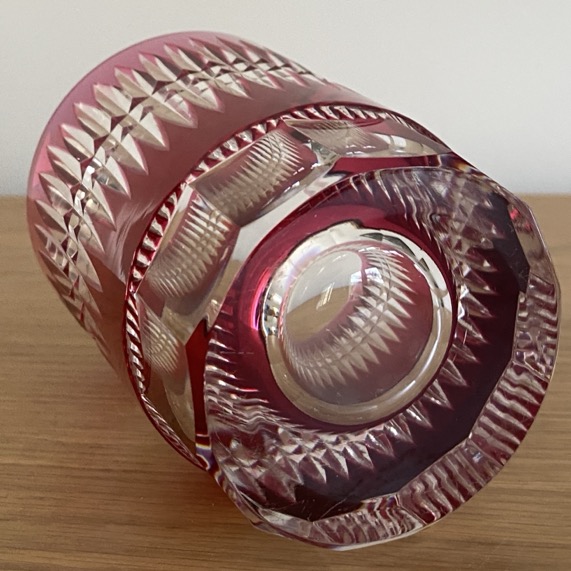 Vase rouge en cristal taillé et doublé (13 cm de haut) issu de la manufacture Val Saint Lambert. Il n’est pas signé.