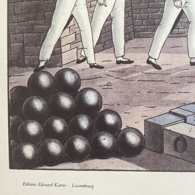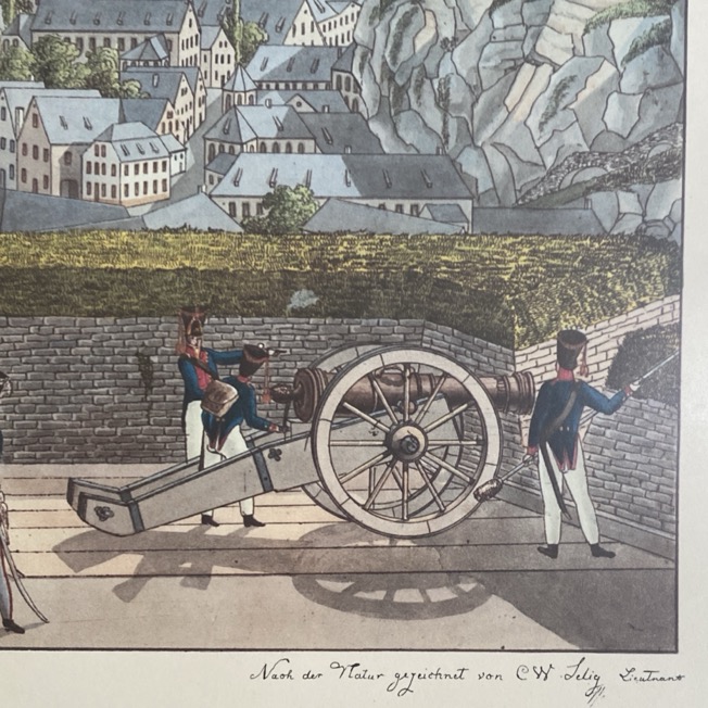 Grand reproduction sous cadre (67×53 cm) d’une vue de Luxembourg « Ansicht von Luxembourg », d’après un dessin de Christophe Wilhelm Selig (1791-1837, officier d’artillerie et peintre allemand). Il s’agit d’une production des editions Edouard Kutter (1934-2022), photographe, éditeur d’Art et propriétaire d’une galerie d’art à Luxembourg.
