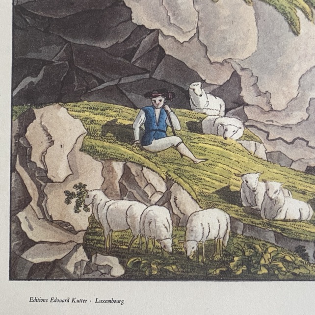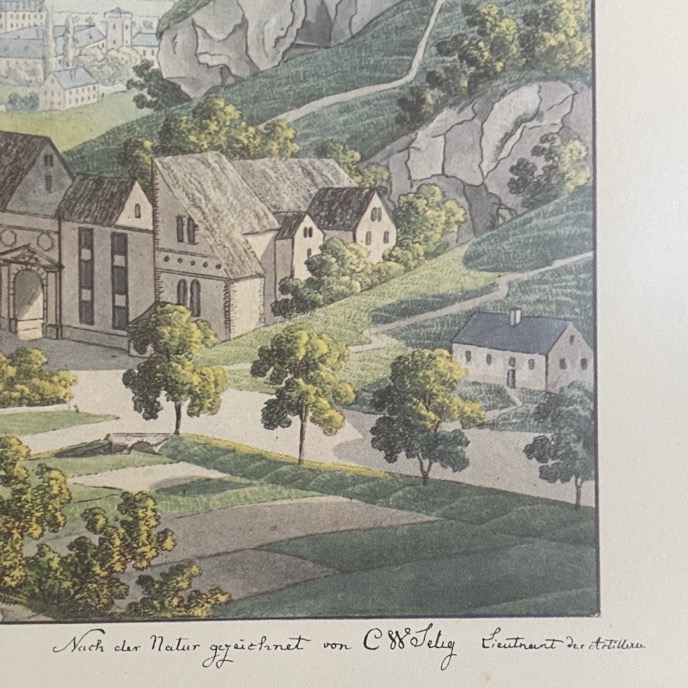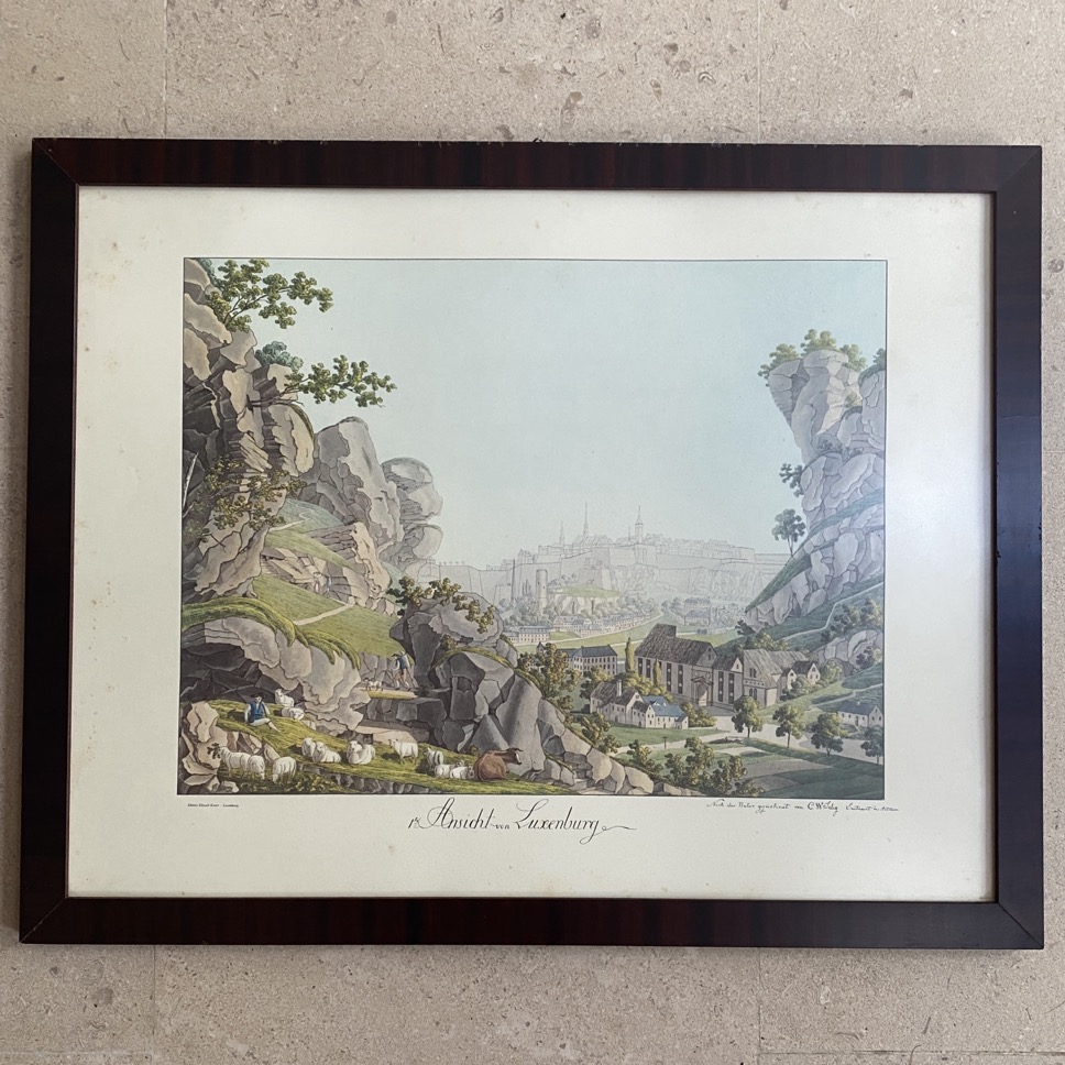 Grand reproduction sous cadre (67×53 cm) d’une vue de Luxembourg « Ansicht von Luxembourg », d’après un dessin de Christophe Wilhelm Selig (1791-1837, officier d’artillerie et peintre allemand). Il s’agit d’une production des editions Edouard Kutter (1934-2022), photographe, éditeur d’Art et propriétaire d’une galerie d’art à Luxembourg.